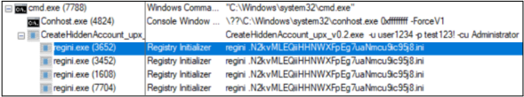 regini は Microsoft が提供する CLI ツールで、テキストファイルを通じて Windows レジストリを編集できるツールである。テキストファイル内でレジストリキーのパス、および権限を指定すると、レジストリキーの作成、変更、削除、権限変更などを実行できる。CreateHiddenAccount で確認された ini ファイルは、RID Hijacking 攻撃のために必要な SAM レジストリのアクセス権限を変更した。このとき、SAM レジストリのパスにデフォルト権限の17(システム権限)以外に1(管理者権限)オプションを追加して、管理者権限で SAM レジストリキーを変更できるようにした。