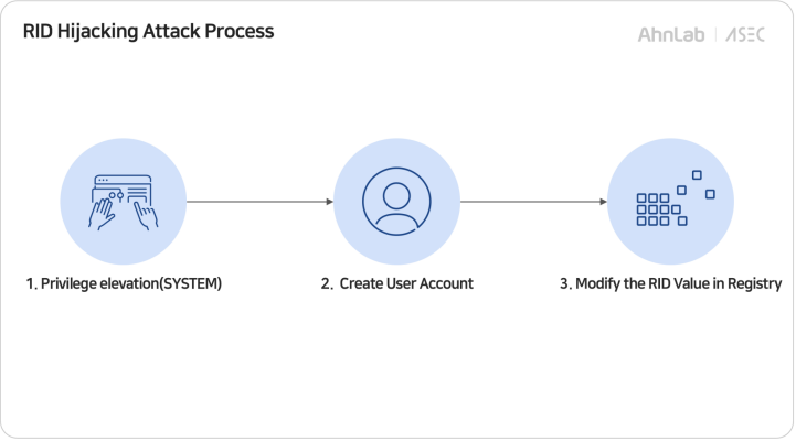 RID Hijacking は、一般ユーザーやゲストアカウントのように制限された権限を持つアカウントの RID(相対識別子)値を、管理者のように高い権限を持つアカウントの RID 値に改ざんする攻撃手法である。韓国インターネット振興院が公開した「TTPs #11:Operation An Octopus – 中央集中型管理ソリューションを狙う攻撃戦略の分析」でも、Andariel 攻撃グループが OS 内にバックドアアカウントを作成するときに RID Hijacking 手法を使用すると言及した。RID Hijacking 攻撃は非表示アカウントを作成し、そのアカウントの RID 値を変更するため、被害を受けた企業がその振る舞いを検知することが難しい。