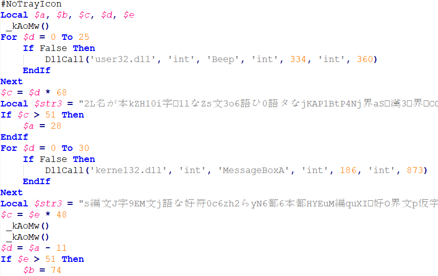 [図8]は不正な AutoIt スクリプト(fdilfn.dll)であり、実際の振る舞いとは関係のないダミーコードで難読化されている。