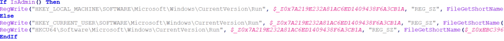 [図10]は、持続性維持のための自動実行登録機能である。自動実行レジストリキーに、名前を偽装した正常な AutoIt ローダー(kmwdxt.txt.exe)の引数で不正な AutoIt スクリプト(fdilfn.dll)を実行するコマンドが[図11]のように登録される。