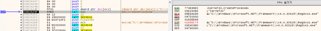 [図14]はシェルコード機能の一部コードで、インジェクションのために正常なプロセス(RegSvcs.exe)を実行(CreateProcessW)するコードである。その後、[表2]のような順序で Remcos マルウェアをインジェクションする。