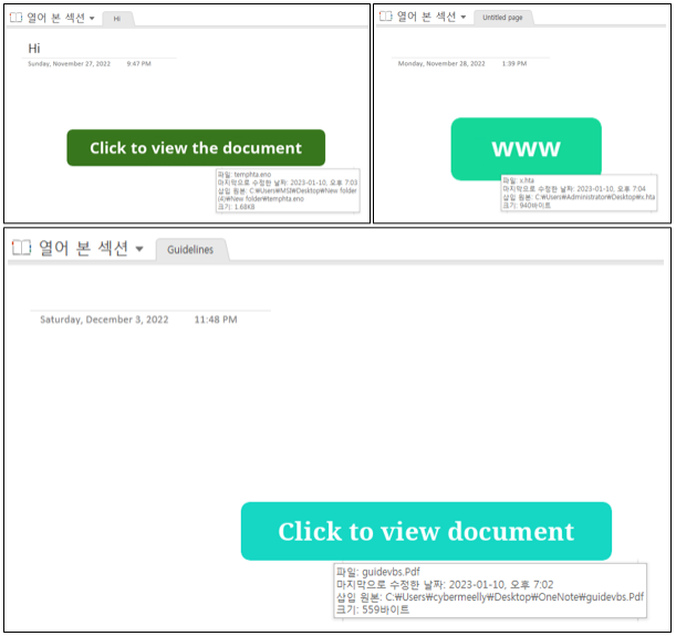 즉, ‘1) 간단한 블록 이미지로 악성 개체를 은닉한 유형’ 과 ‘2) 보다 더 정교하게 제작한 악성 OneNote 유형’ 으로 분류하였는데, 예시 샘플에 대한 이미지는 다음과 같다.
