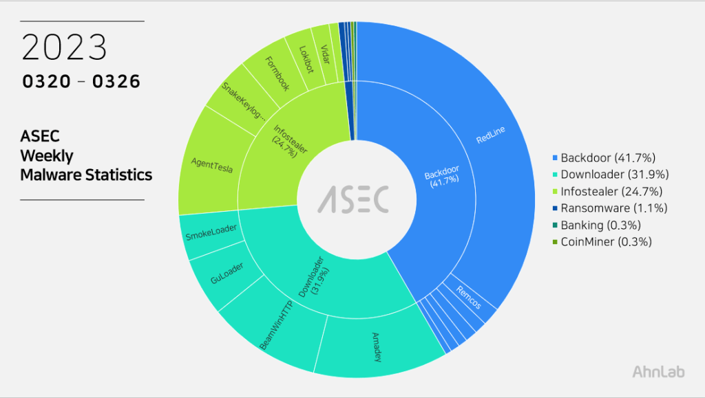 ASEC(AhnLab Security Emergency response Center)에서는 ASEC 자동 분석 시스템 RAPIT 을 활용하여 알려진 악성코드들에 대한 분류 및 대응을 진행하고 있다. 본 포스팅에서는 2023년 3월 20일 월요일부터 3월 26일 일요일까지 한 주간 수집된 악성코드의 통계를 정리한다.