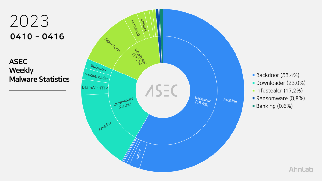 ASEC(AhnLab Security Emergency response Center)에서는 ASEC 자동 분석 시스템 RAPIT 을 활용하여 알려진 악성코드들에 대한 분류 및 대응을 진행하고 있다. 본 포스팅에서는 2023년 4월 10일 월요일부터 4월 16일 일요일까지 한 주간 수집된 악성코드의 통계를 정리한다.